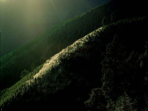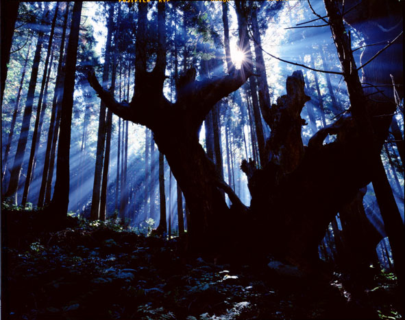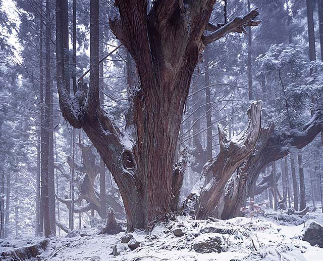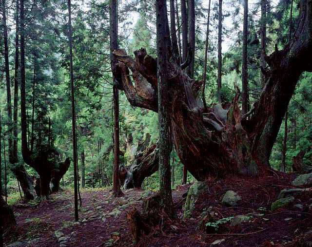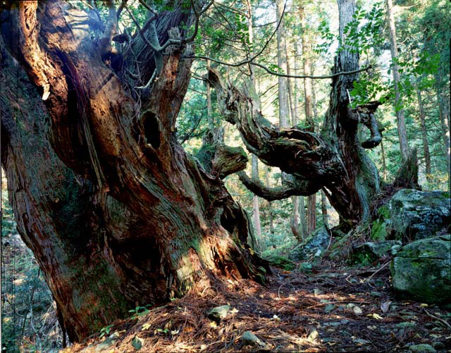 岐阜県関市にあるこの古木は、杉の木でここでは株杉といわれています。直径が1mを越えるものが、この地域に約30株あり、樹齢は、400-500年と推定されています。一般の株杉は、A型ですが、ここには、B型、C型のものがあります。1993年前より少しづつ、大型(4×5)フィルムカメラで撮影をしてきました。できるだけ、全体を見えるように撮影してきました。今は、整備され、このような全体を写すことは難しくなってきました。