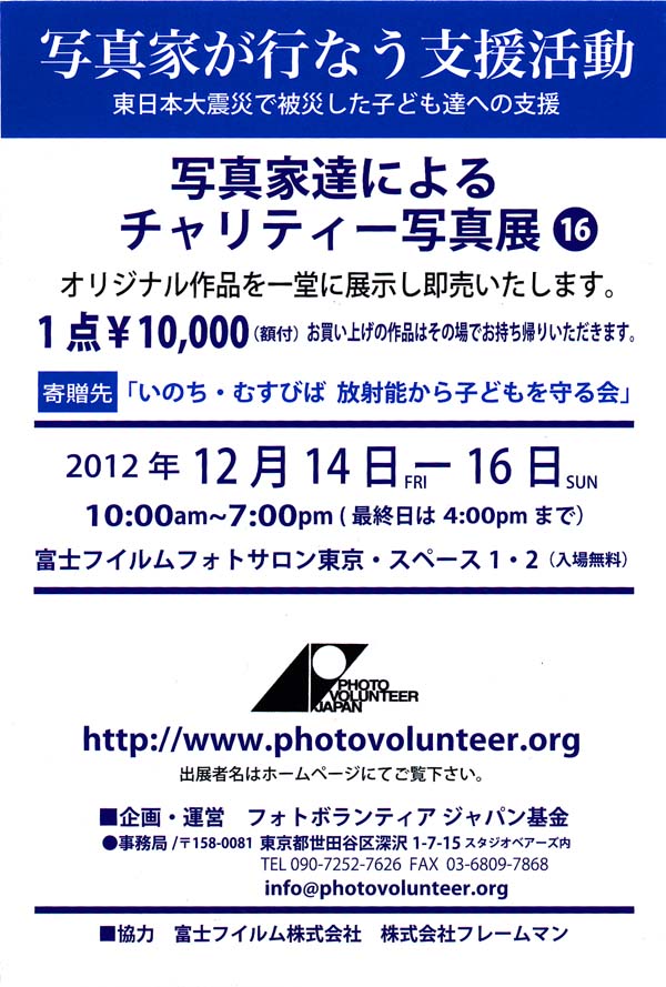 | ■写真家 チャリティー写真展16のお知らせ 2012.12.14金〜16日 10:00-19:00(最終日16:00) http://www.jps.gr.jp/events/other/index.html 富士フォトサロン/東京 |