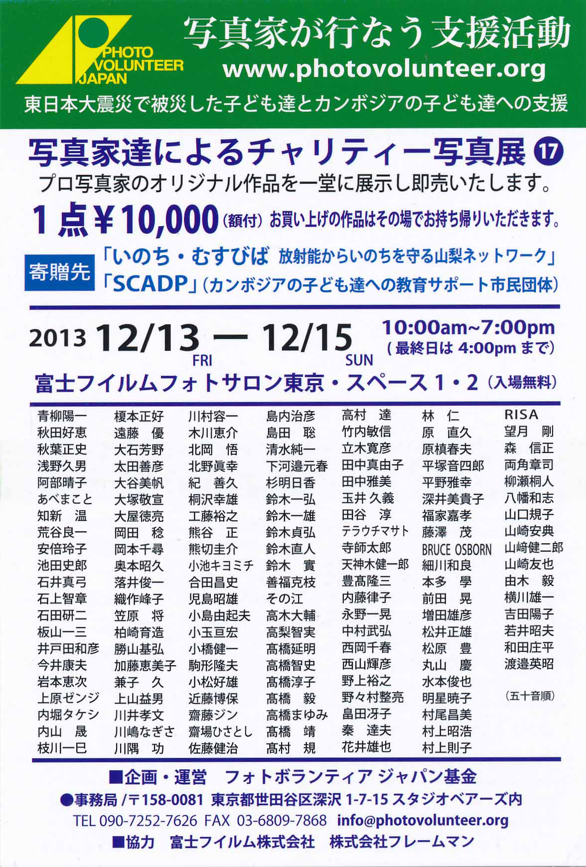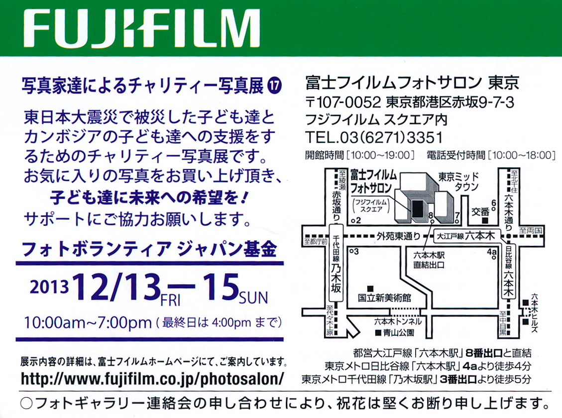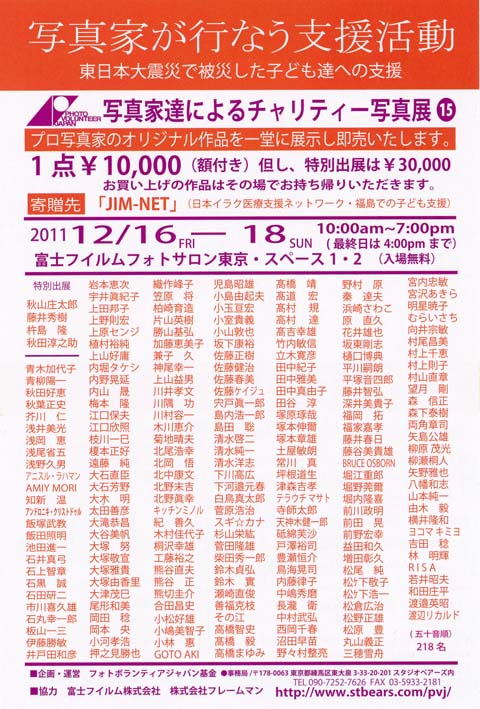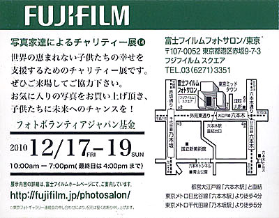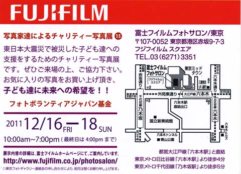 | ■写真家達によるチャリティー展15に参加しています。 2011.12.16(金)-18(日) フジフィルムフォトサロン/東京 富士フォトサロン/東京 |