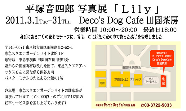 | ■平塚音四郎 写真展「 L i l y 」 2011.3.1Tue-31Thu Deco's Dog Cafe 田園茶房 営業時間 10:00〜20:00 最終日写真展示は18:00 身近にあるユリの花をモチーフに、普段、なにげなく家の中で飾った感じを表現しました |