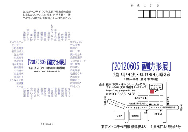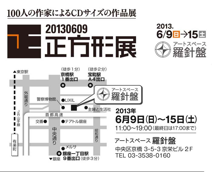 | ■正方形展 2013.6.9(日)-6.15(土) アートスペース羅針盤11:00〜19:00 最終日17時 CDのジャケットに入った作品展です。写真、絵画、版画などいろいろなジャンルの方たちとのグループ展です。 東京都 中央区 京橋 3-5-3 京栄ビル2F http://rashin.net/index.php |