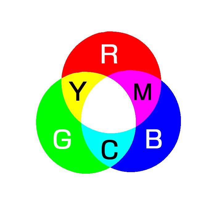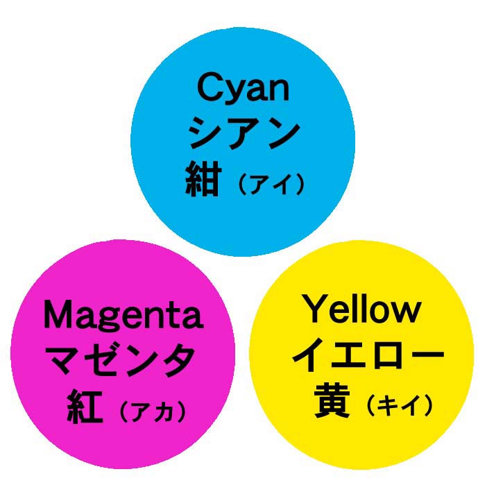 場合、紙にインキをつけて表現しています。理屈では、光の3原色は3色が交わると白になります。(加色混合法)色の